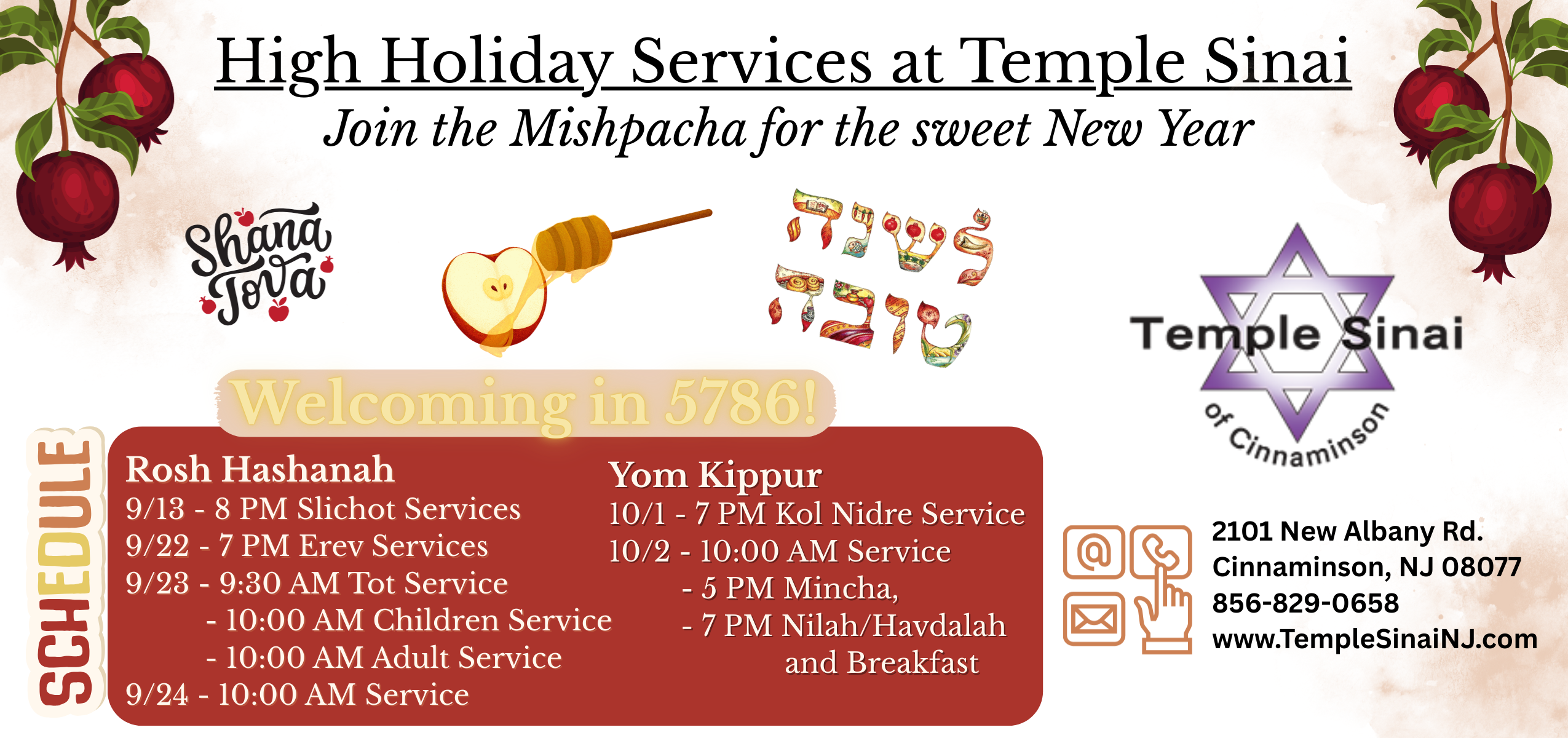 Contact by phone: 856 829-0658 Via fax: 856 829-0310 Via email: templesinainj@verizon.net General Information call Amy Engle at 856 829-0658 Membership Information call Dorothy Minkoff at 856 829-6293 or Rose Rose at 856 858-6953 Religious School Principal, Marcia Blacker: templesinaischool@verizon.net Rabbi Fineblum (email): rabbifineblum@verizon.net Website feedback, comments, and corrections: David Kramer – dave@templesinainj.com Office Hours (During the school year) Sunday 8:30 am to noon Monday, Wednesday & Thursday 9:00 am to 2:00 pm Tuesday 9:00 am to noon 3:30 pm to 8:30 pm Office Hours (Summer) Monday – Thursday 9:00 am to noon Script Scrip will be sold any time the Temple office is open. Since there is only one person in the office, you may want to call before you come in (856 829-0658). Please leave a message if the answering machine picks up and you will receive a call back.