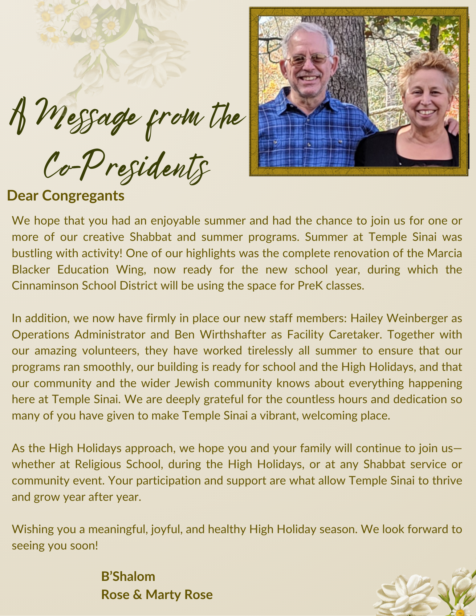 Shana Tovah U’Mitukah from Marty and Rose Rose, Co-Presidents for 5786